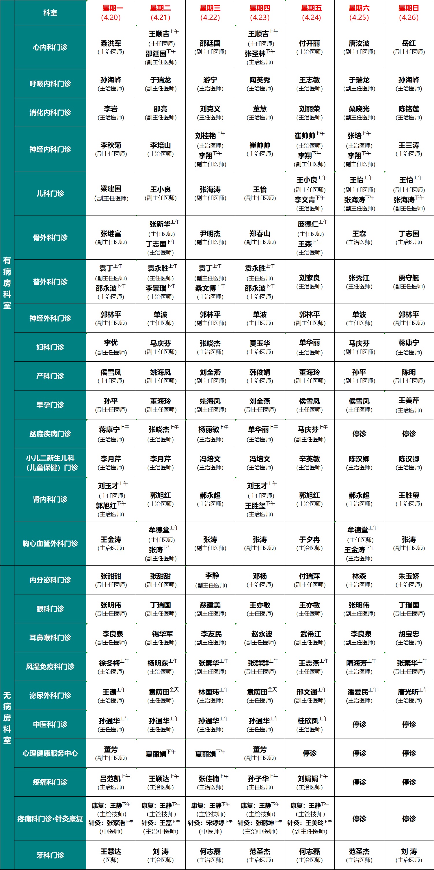 门诊医生坐诊时间一览表(东院区)