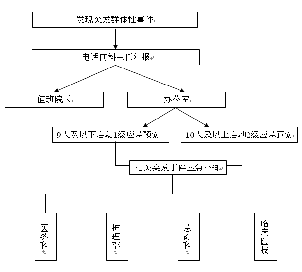 若群体性事件(中、重度)为10人及以上,启动二级应急预案,办公室值班员通知医务科、护理部主任启动二级应急预案。