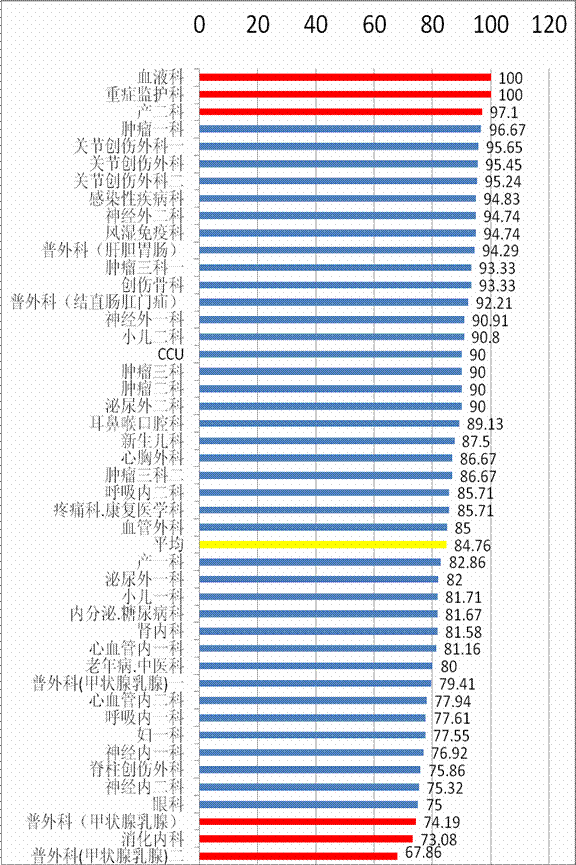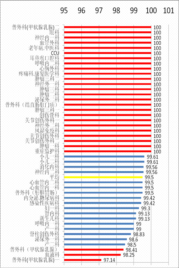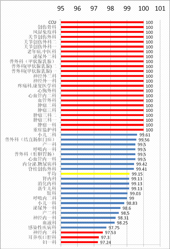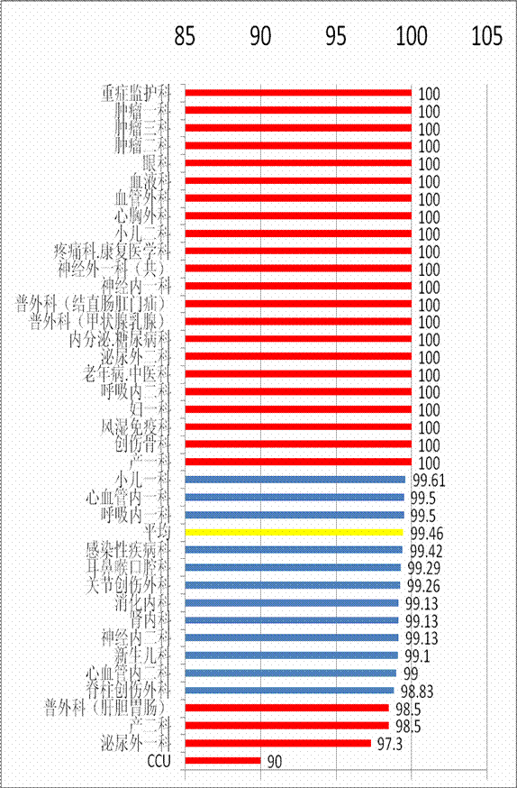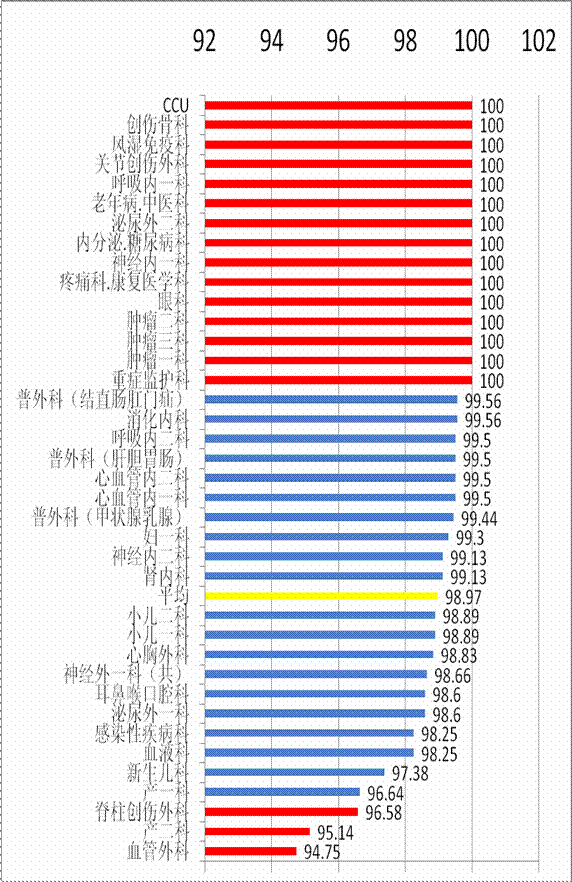 (1).临床科室出院病人满意度分析:本月要求出院病人回访到位用户数1900位,各指标平均满意度得分96.43分。平均满意率96.85%。