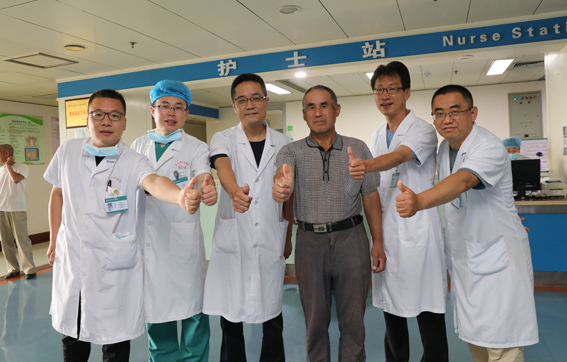 做好了充分的各种预案和术前准备后,心胸外科在麻醉科、手术室的大力配合下,为文先生进行了胸腔镜下微创肺叶切除术。手术非常顺利。但术后第二天凌晨,出现了预料中的也是大家都不愿看到的情况:快速室性心律失常!这种情况如果不及时进行处理,很快将诱发室颤从而危及生命,也就是我们经常说的“猝死”。崔保明主任迅速为病人用药物进行纠正,同时安排医护人员在第一时间将病人送往CCU(冠心病重症监护病房)。药物纠正无效,CCU王德泉主任果断为病人进行了心脏电复律纠正,一次成功。经过几天的继续生命支持,病人终于度过危险期!在CCU进行救治期间,崔保明主任安排科室大夫每天多次协助处理外科情况,和CCU大夫共同制定方案。经过两个科室医护人员的共同努力,病人身上的引流管被很快拔除,6天过后病情稳定。随后又在心胸外科做了进一步的恢复治疗后,顺利出院,也就出现了文章开头的一幕。